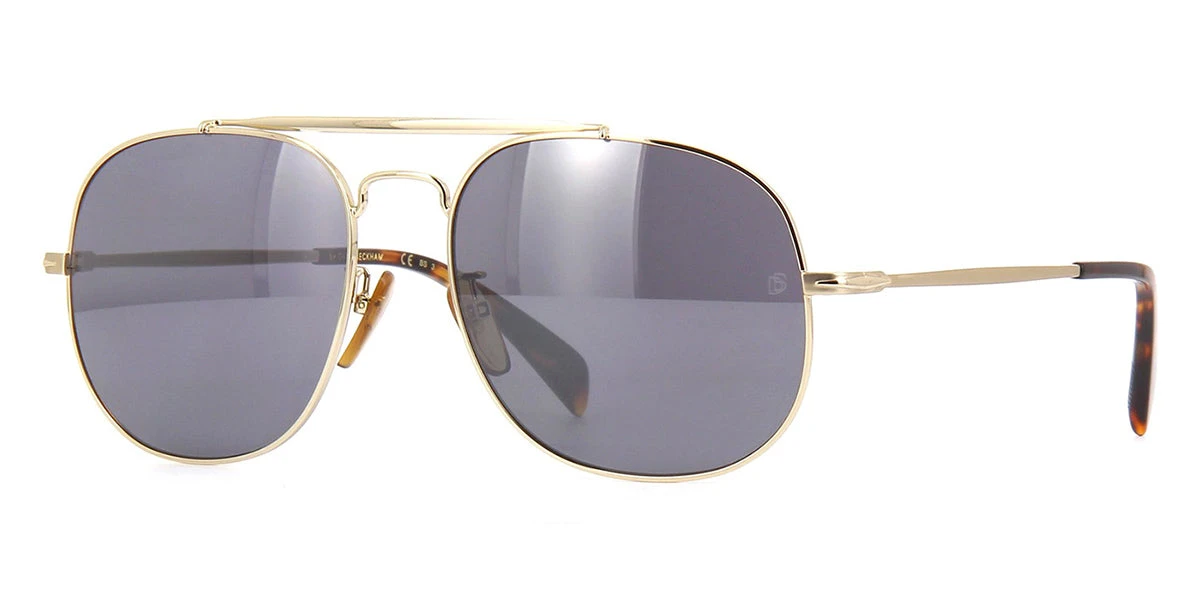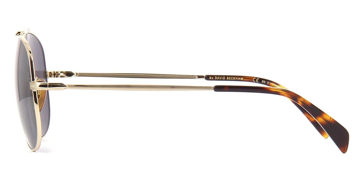 This square David Beckham sunglass comes in a gold frame with grey lenses.