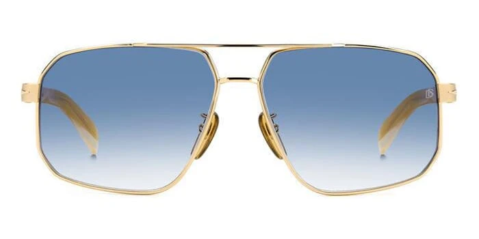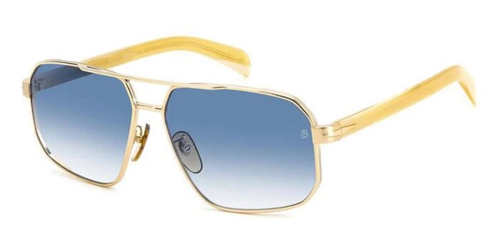 This rectangular David Beckham sunglass comes in a striped beige and gold frame with blue gradient lenses.