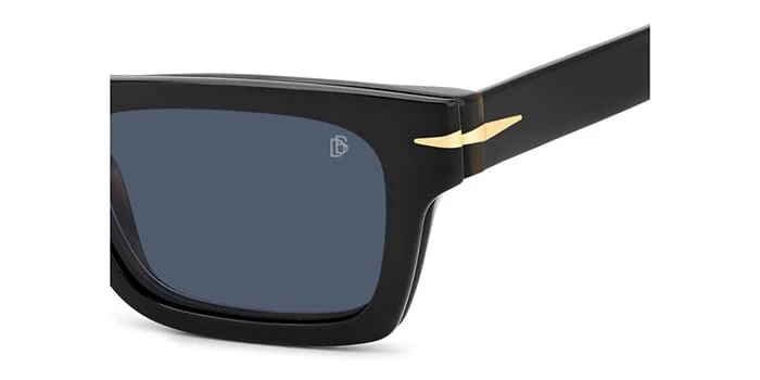 This square David Beckham optical comes in a black with havana frame with blue lenses.