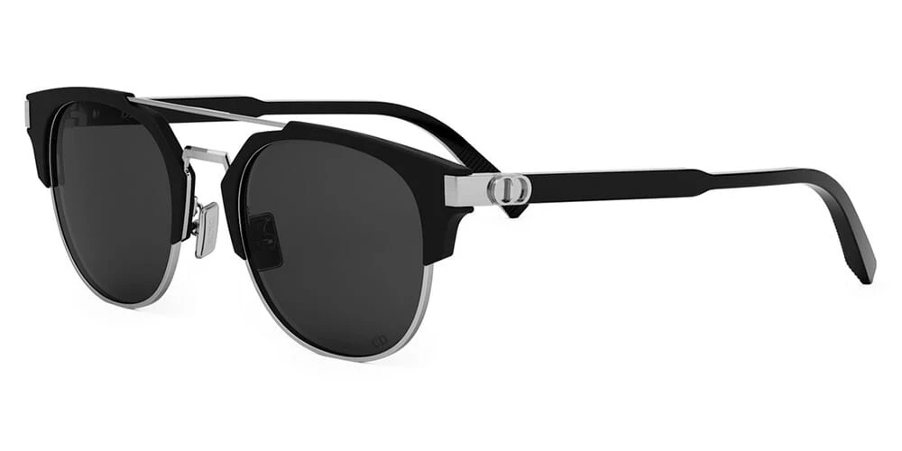 This square Dior sunglass comes in a matte black and silver frame with grey with light mirror lenses.