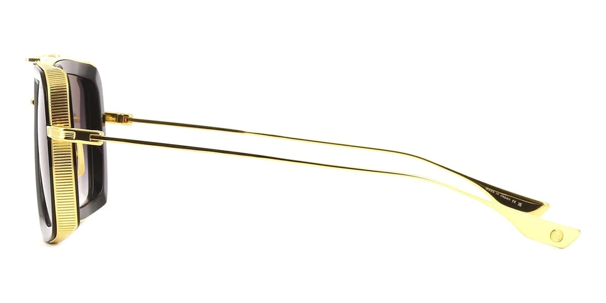 This square Dita sunglass comes in a yellow gold and shiny black frame with grey to clear gradient lenses.