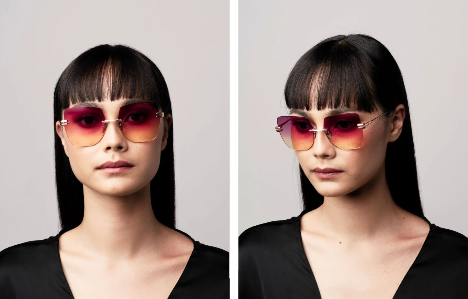 This square Dita sunglass comes in a brushed rose gold and silver frame with red to yellow gradient lenses.