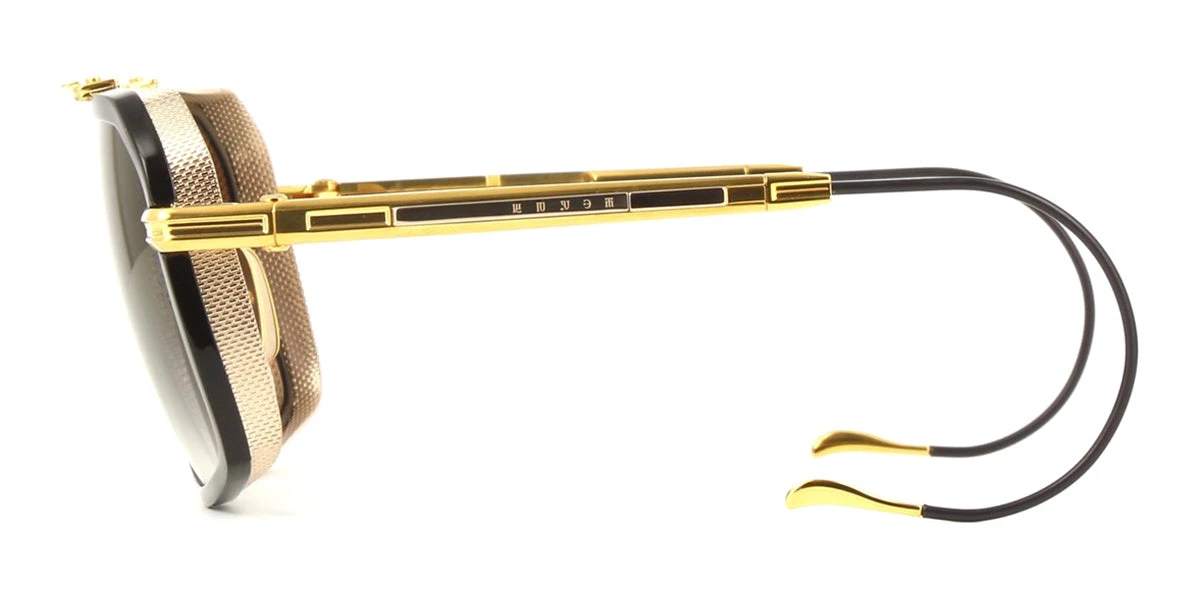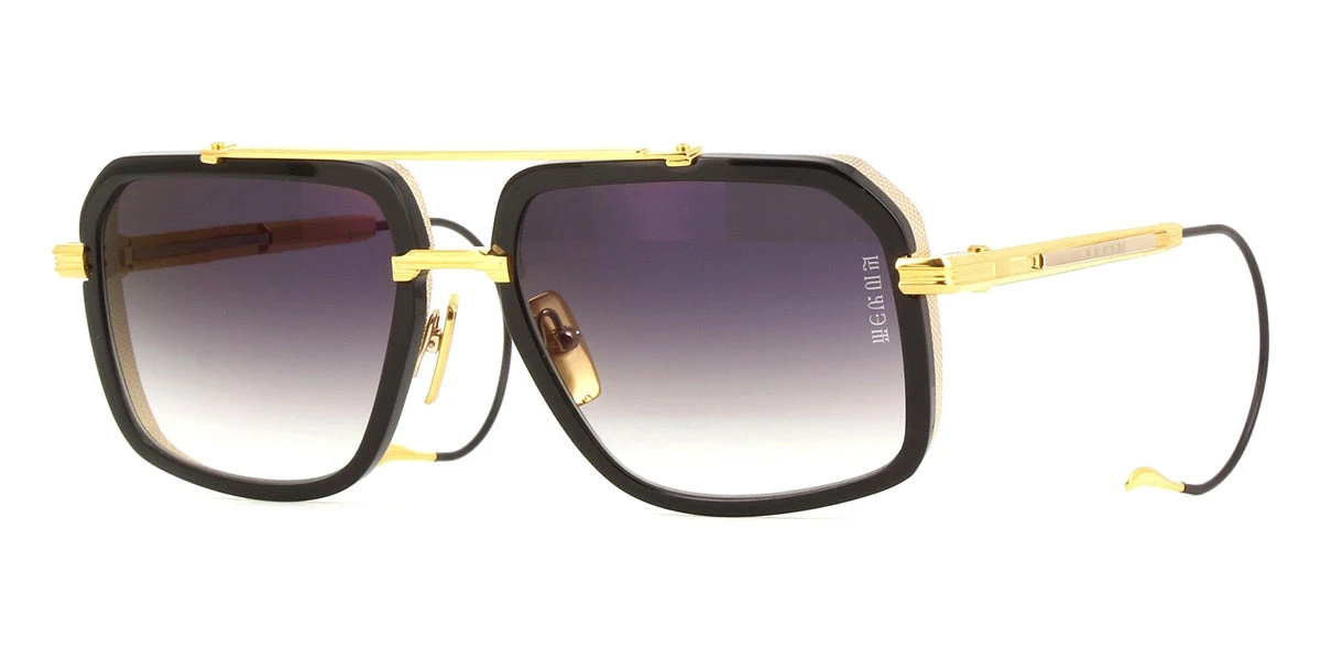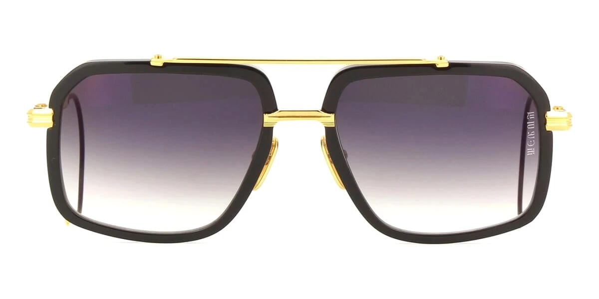 This square Dita sunglass comes in a shiny black with yellow gold frame with dark grey to clear gradient lenses.