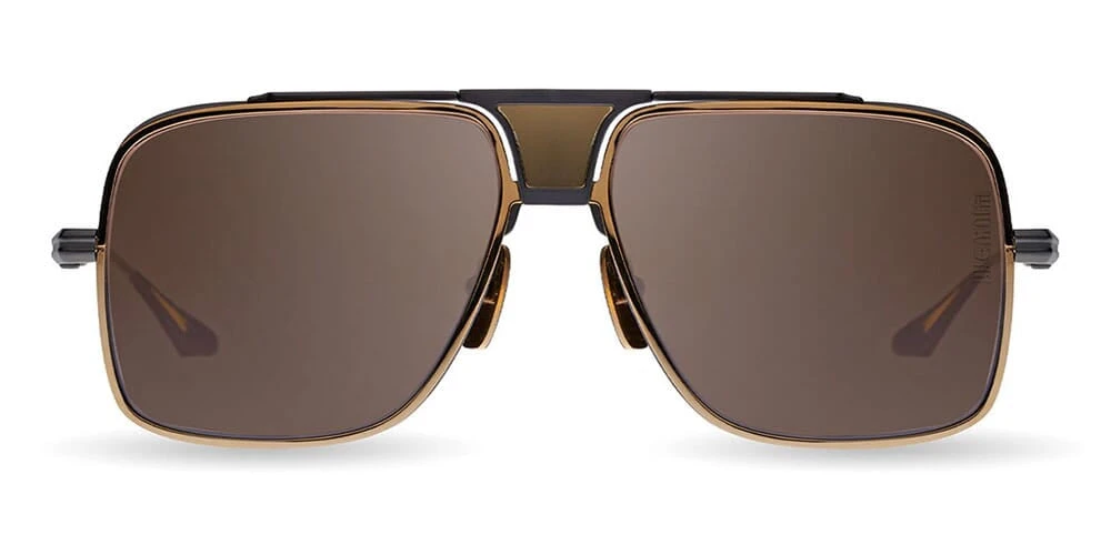 This square Dita sunglass comes in a black iron with yellow gold frame with dark brown with black flash mirror polarised lenses.