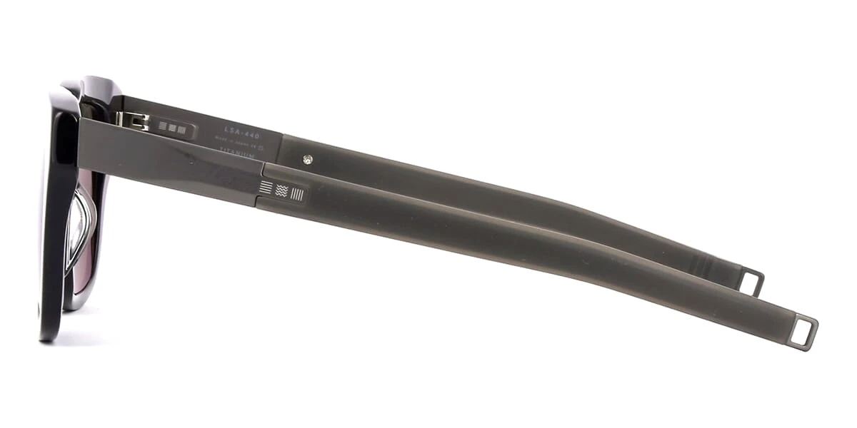 This square Dita Lancier sunglass comes in a shiny black and gunmetal grey frame with air green lenses.