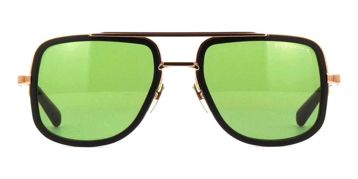 This square Dita sunglass comes in Rose Gold and Matte Black frame with vintage green lenses.