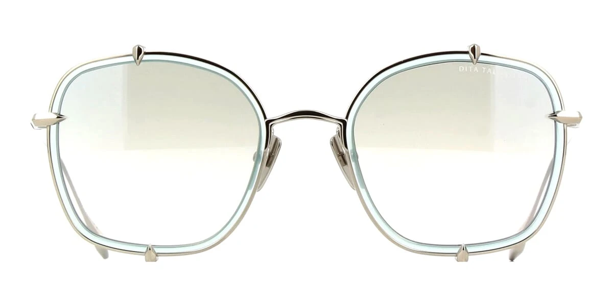 This square Dita sunglass comes in a green beach glass and silver frame with sage pink wash flash lenses.