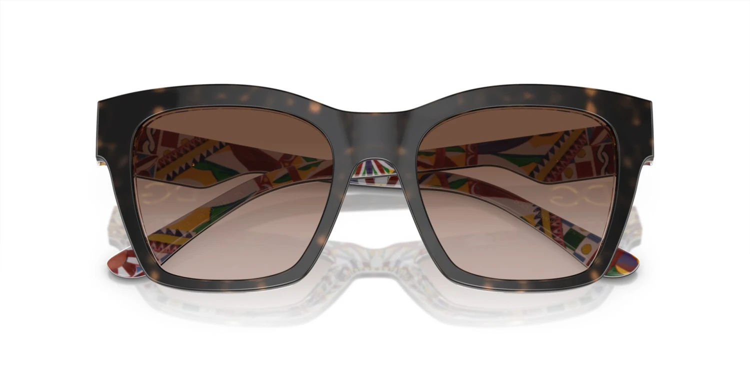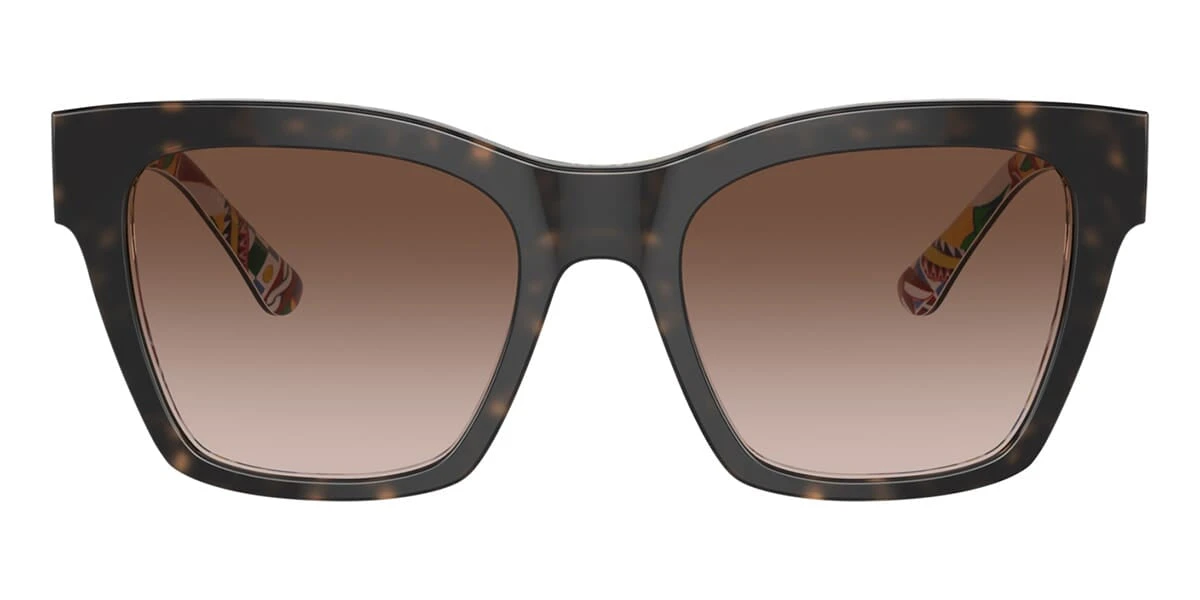 This square Dolce&Gabbana sunglass comes in a havana on white barrow frame with brown gradient lenses.