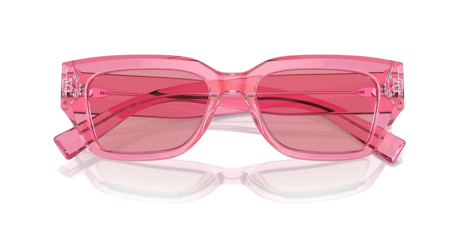 This cat eye Dolce&Gabbana sunglass comes in a pink crystal frame with pink with internal silver mirror lenses.