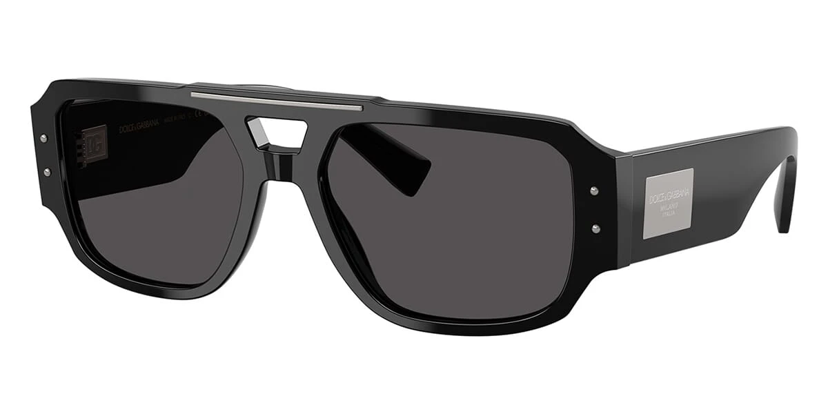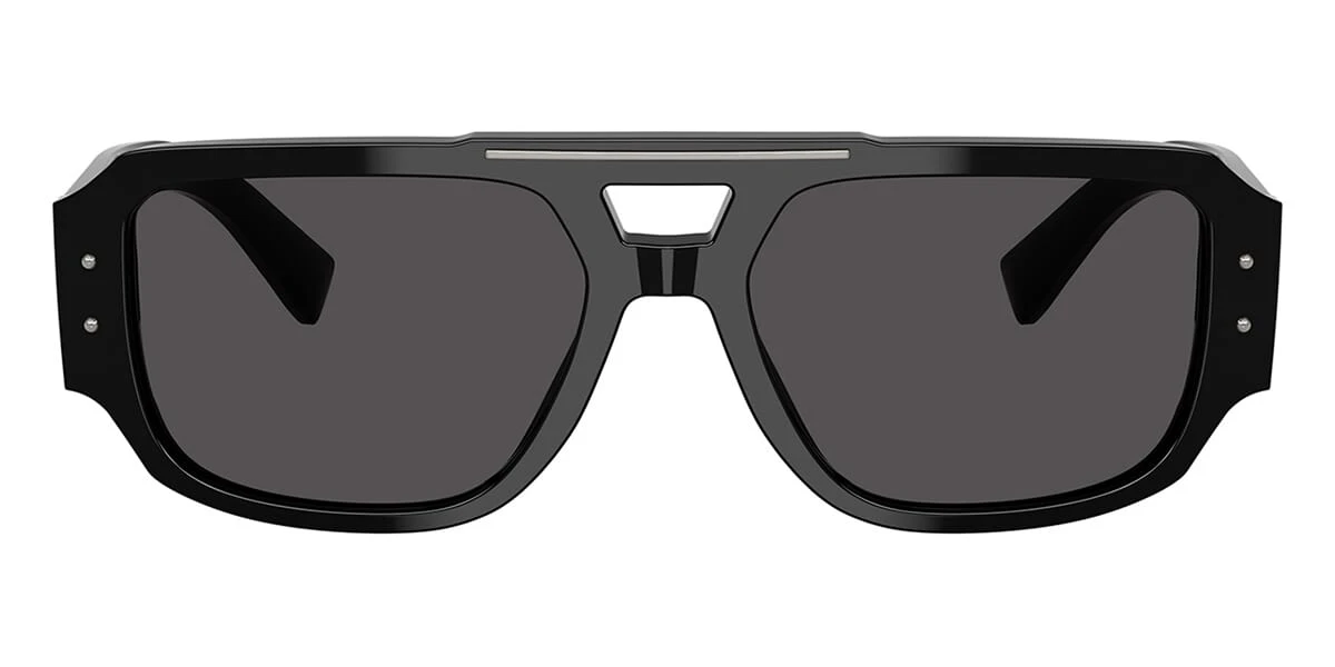 This rectangular Dolce&Gabbana sunglass comes in a black frame with dark grey lenses.