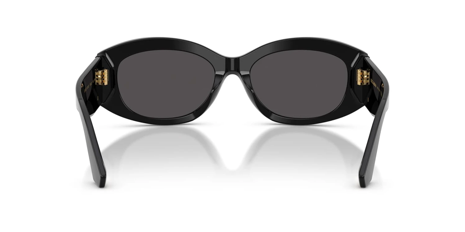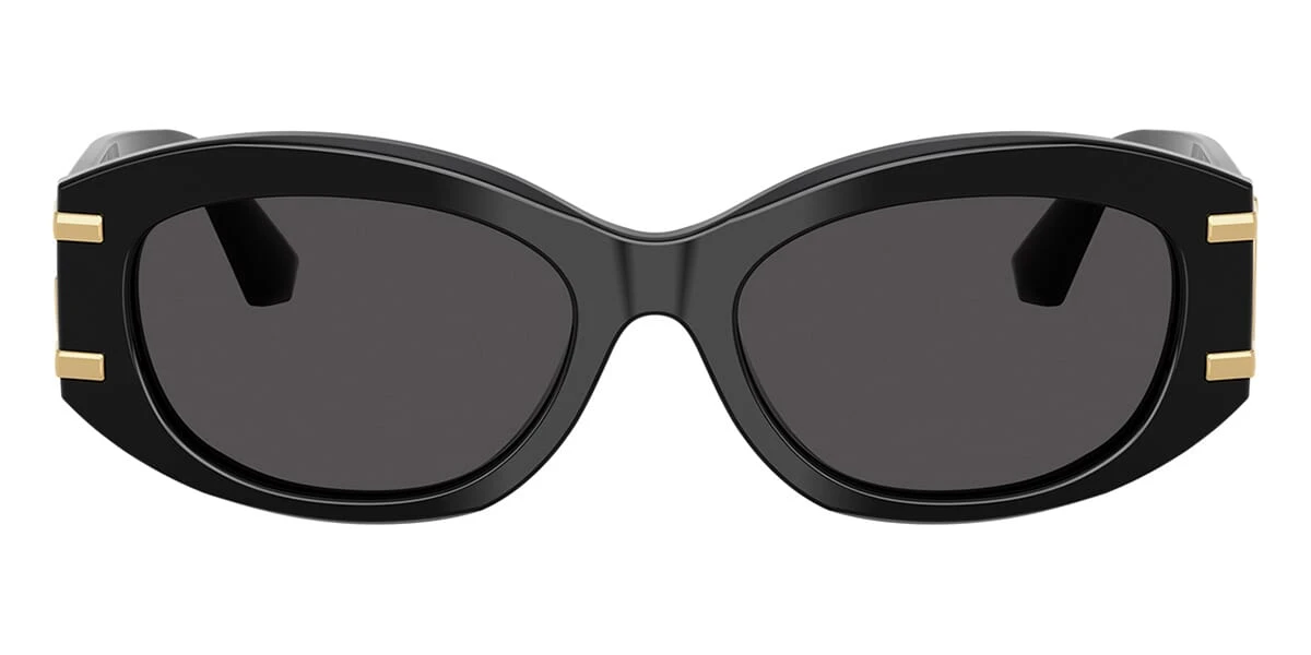 This round Dolce&Gabbana sunglass comes in a black frame with dark grey lenses.