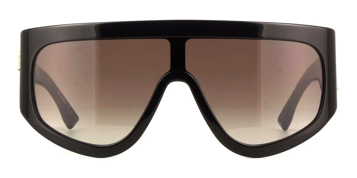 This shield Dsquared2 sunglass comes in a shiny black frame with brown gradient lenses.
