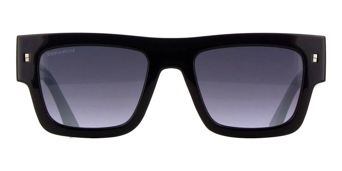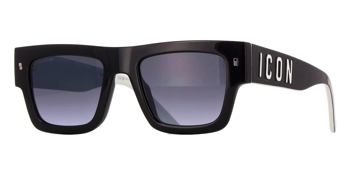 This square Dsquared2 sunglass comes in a shiny black and ivory white frame with grey gradient lenses.