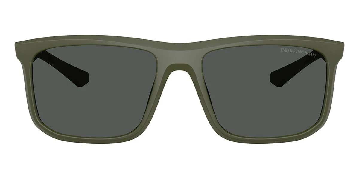 This square Emporio Armani sunglass comes in a matte green frame with dark grey lenses.