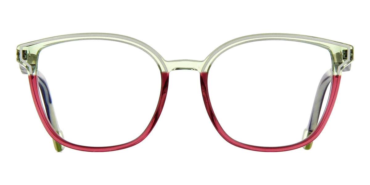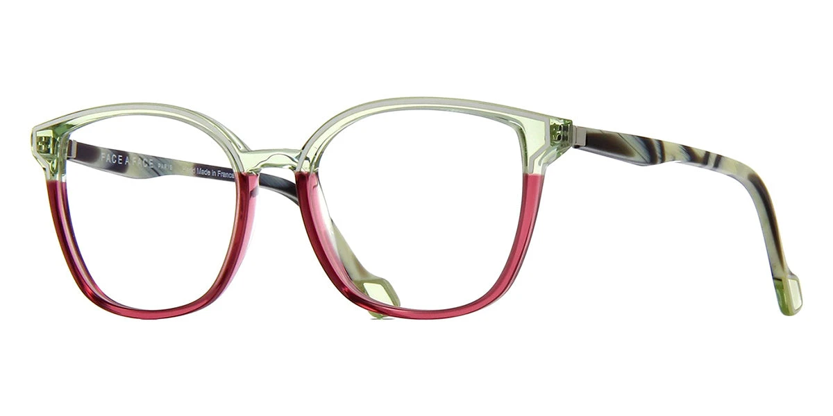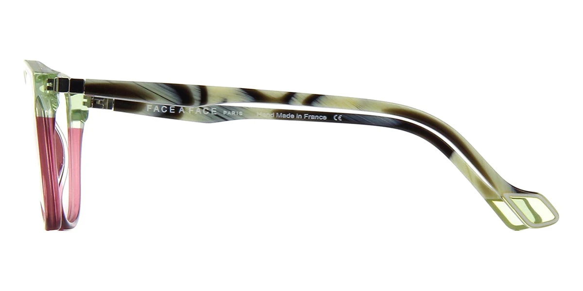This square Face A Face optical comes in a green and pink crystal with horn frame.
