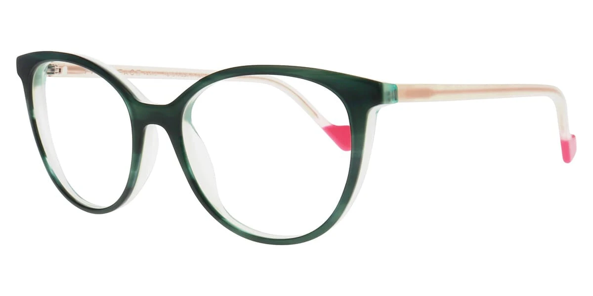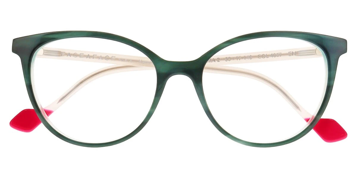 This cat eye Face A Face optical comes in a tortoise green irise frame.
