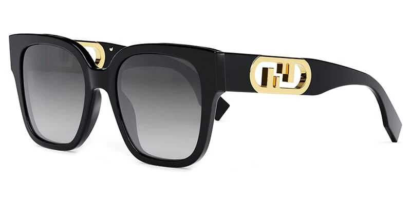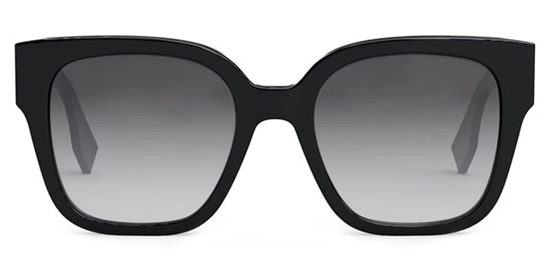 This folding square Fendi sunglass comes in a shiny solid black frame with grey gradient lenses.