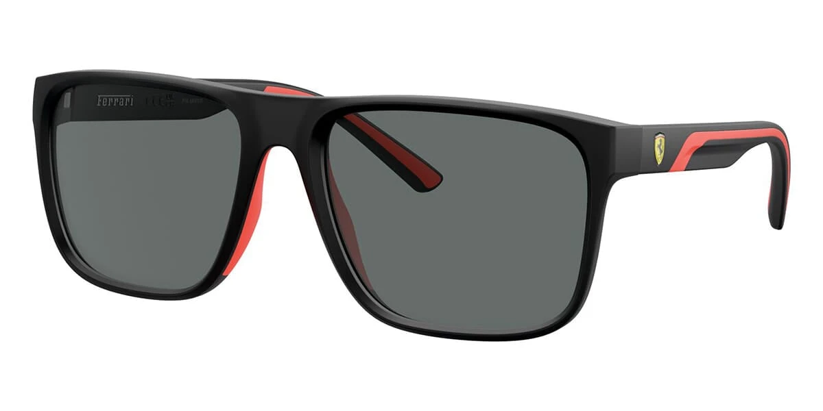 This square Ferrari Scuderia sunglass comes in a matte black frame with grey polarised lenses.
