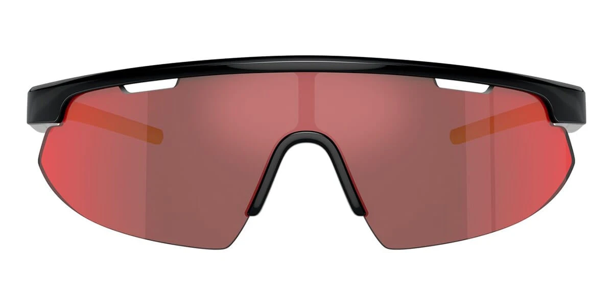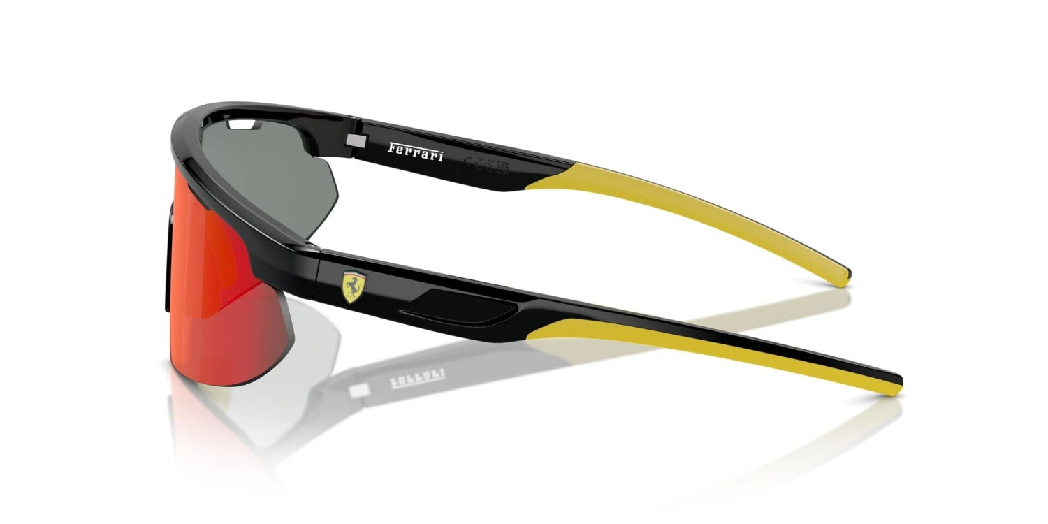 This shield Ferrari Scuderia sunglass comes in a black frame with grey smoke with red gold flash mirror lenses.