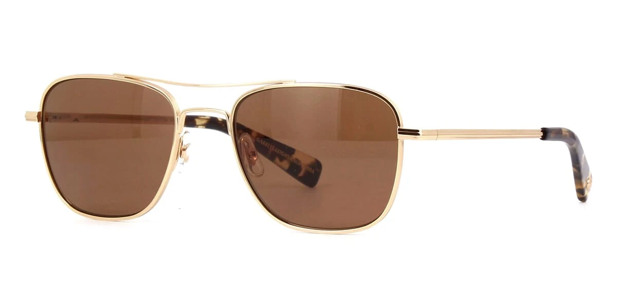 This aviator Garrett Leight sunglass comes in a shiny gold with yellow tortoise frame with brown lenses.