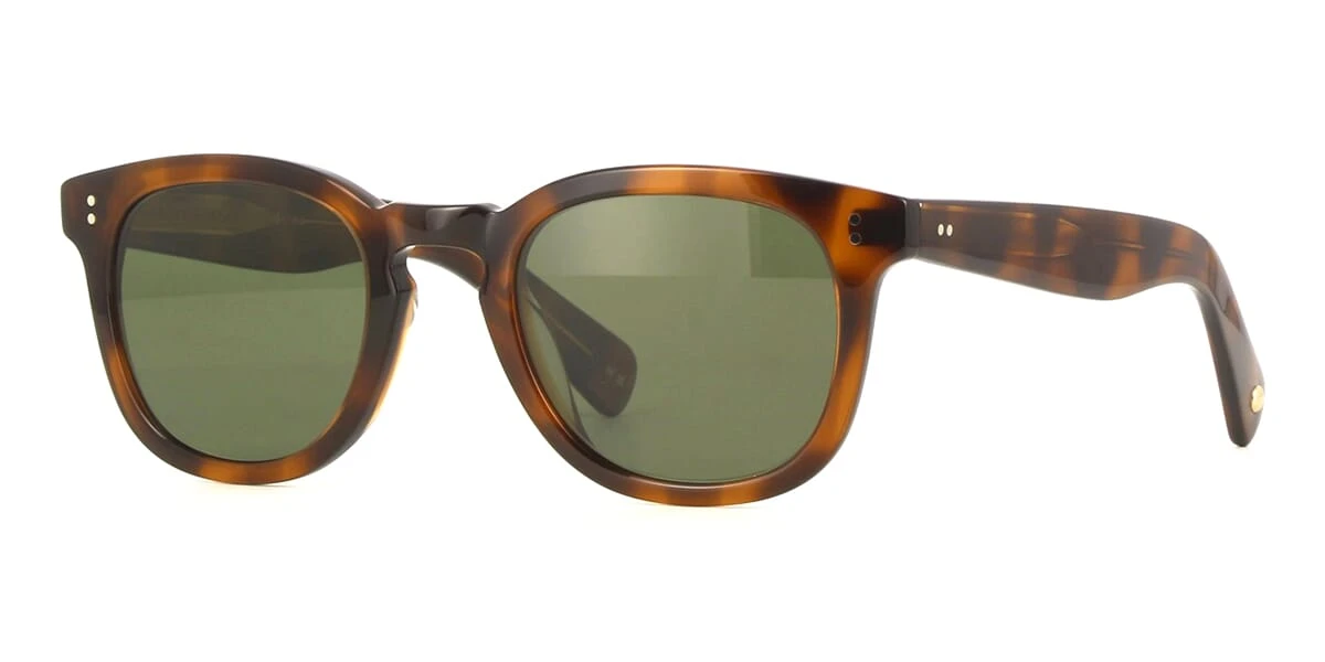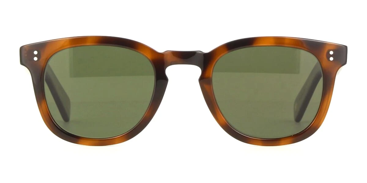 This square Garrett Leight sunglass comes in a spotted brown shell frame with semi flat pure green polarised lenses.