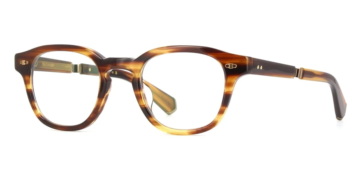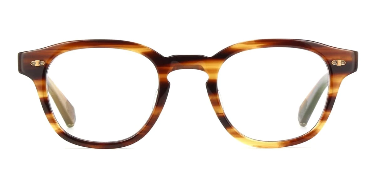 This square Garrett Leight optical comes in a koa with antique gold frame.