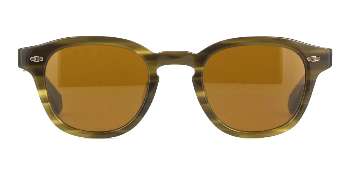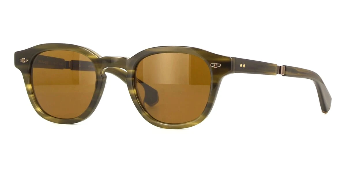 This square Garrett Leight sunglass comes in a kelp antique gold frame with mojave brown lenses.