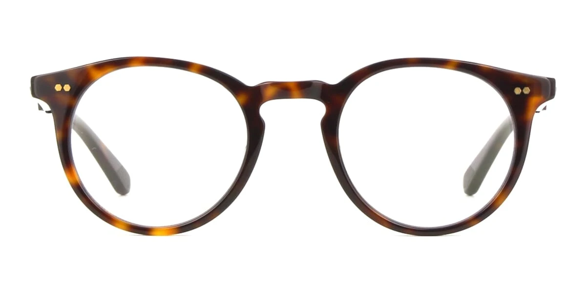 This round Garrett Leight optical comes in a hickory tortoise frame.