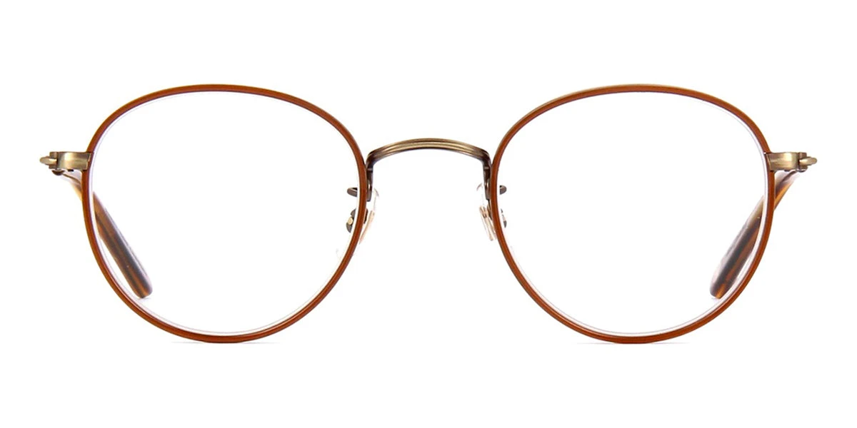 This round Garrett Leight optical comes in a honey with antique gold ii and demi blonde frame.