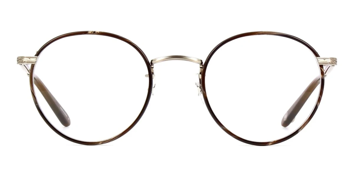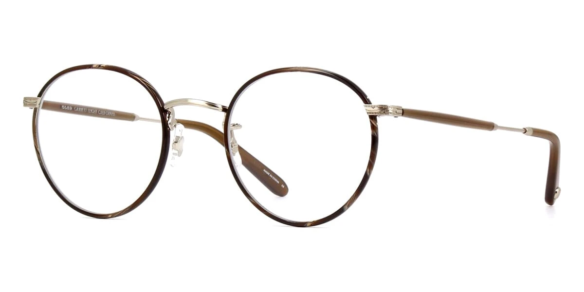 This round Garrett Leight optical comes in a dark wave rock with brushed silver and hazel frame.