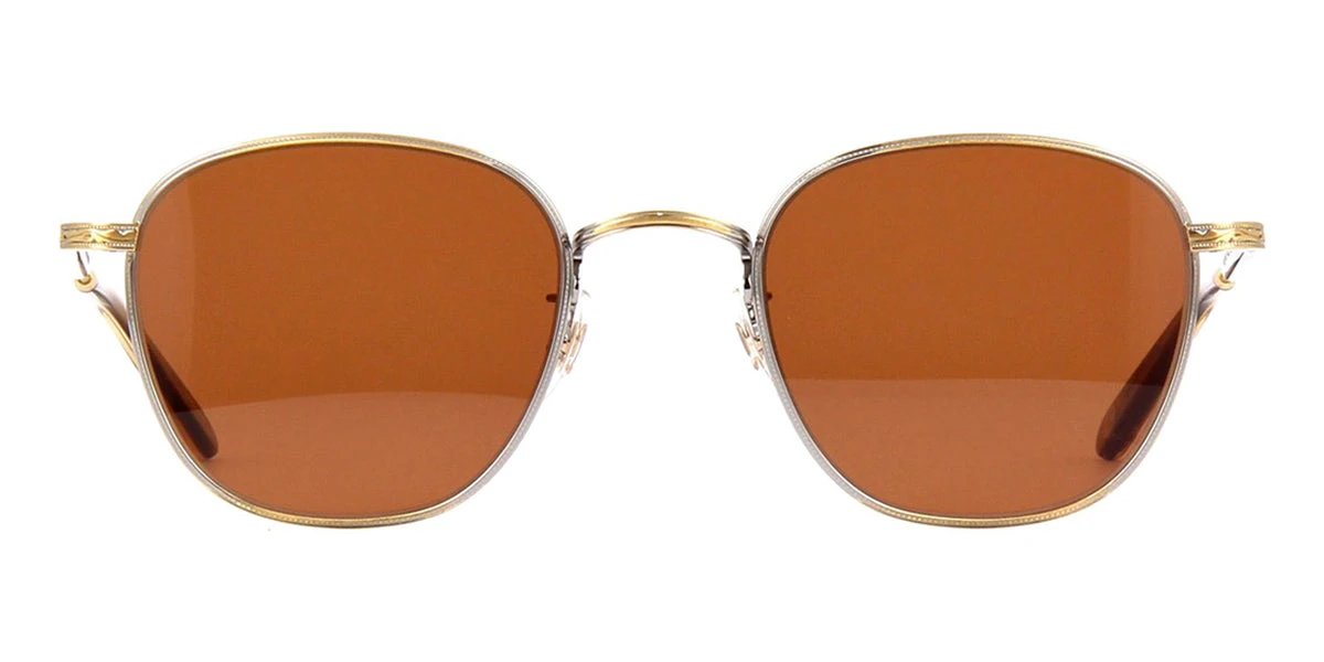 This square Garrett Leight sunglass comes in a antique gold and khaki tortoise frame with semi-flat oak lenses.