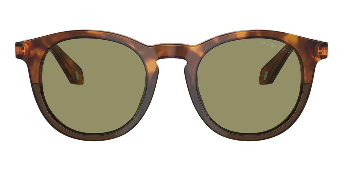 This round Giorgio Armani sunglass comes in a red havana frame with green lenses.