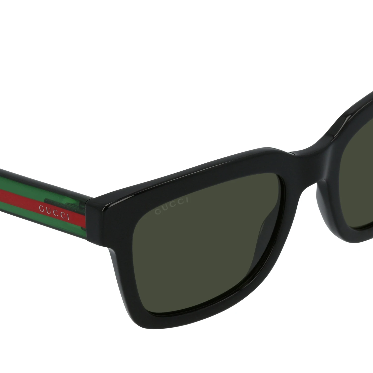This wayfarer Gucci sunglass comes in a black and green with red stripe frame with green lenses.