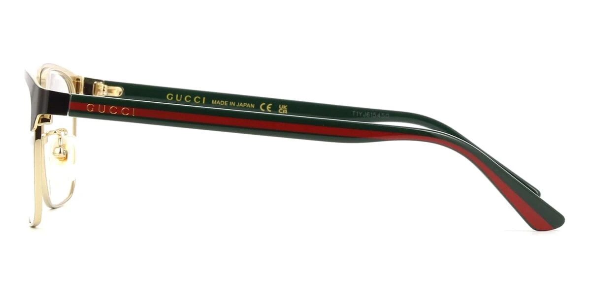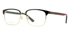 This square Gucci optical comes in a shiny black and gold with red and green stripes frame.