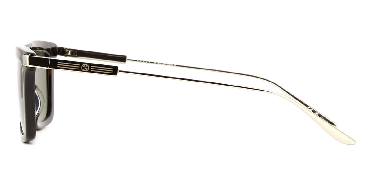 This square Gucci sunglass comes in a shiny dark havana and silver frame with green with light mirror lenses.
