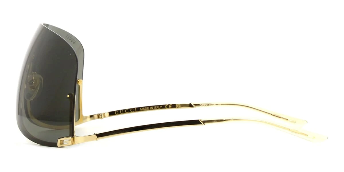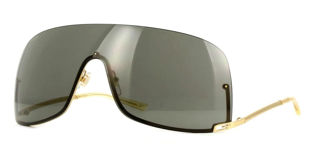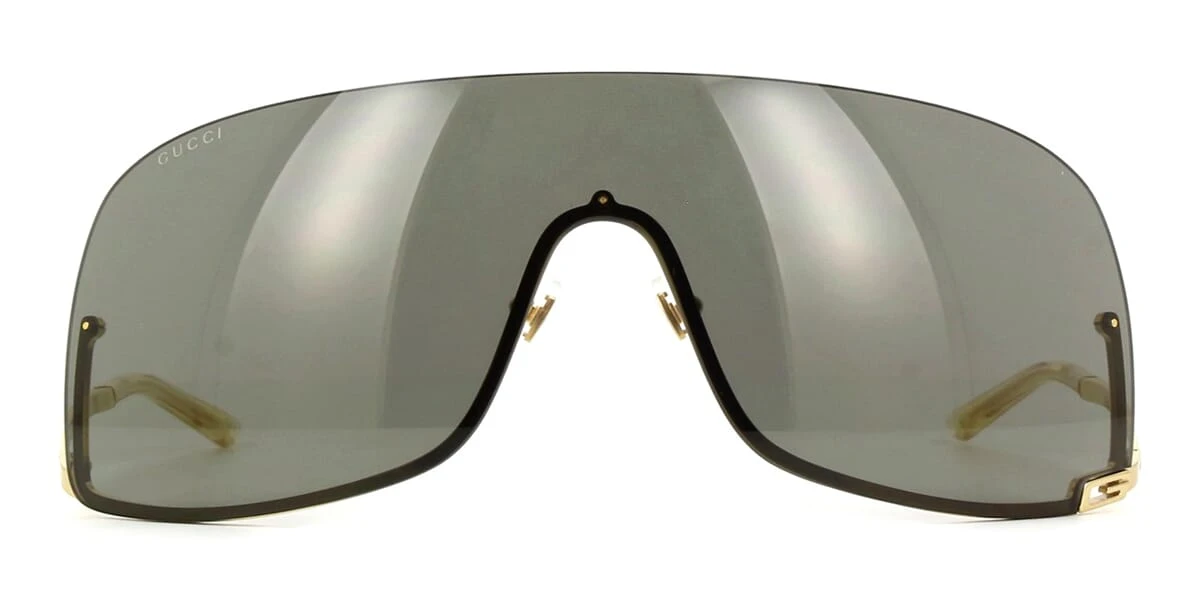 This wraparound Gucci sunglass comes in a shiny gold frame with grey with light mirror lenses.