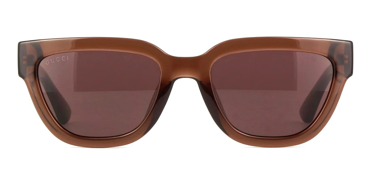 This square Gucci sunglass comes in a shiny brown frame with violet lenses.