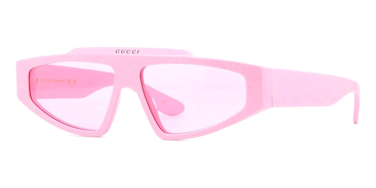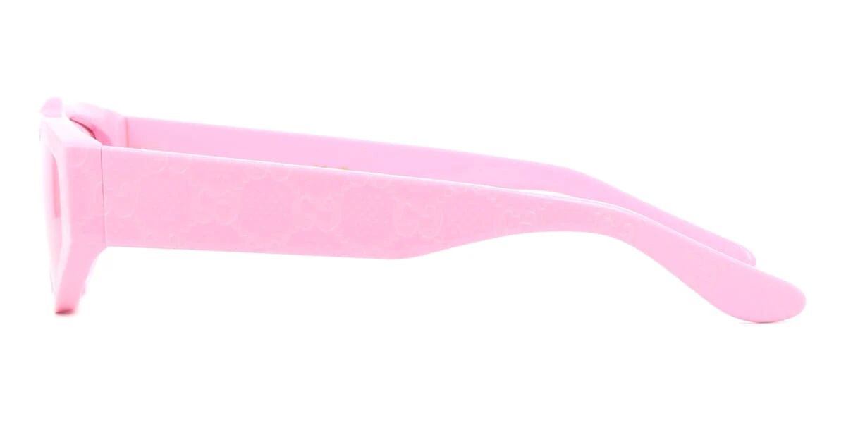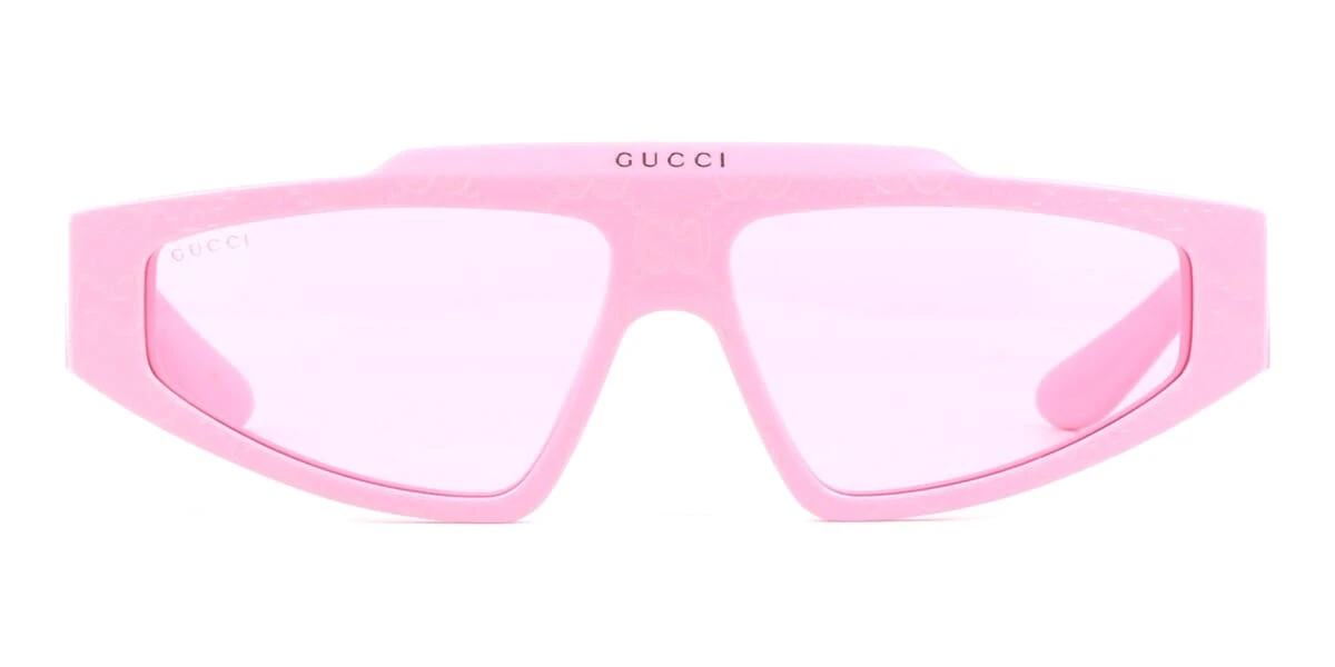 This rectangular Gucci sunglass comes in a shiny pink with logo pattern frame with light pink lenses.