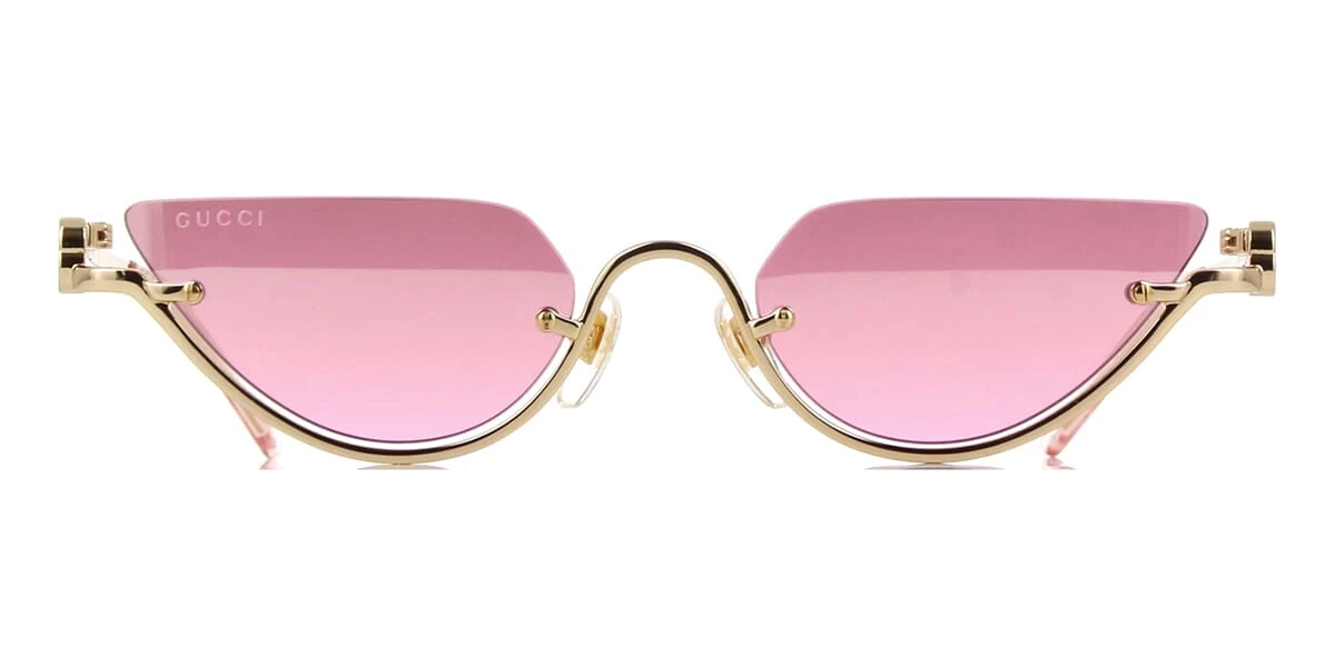 This cat eye Gucci sunglass comes in a shiny gold frame with pink with light mirror lenses.
