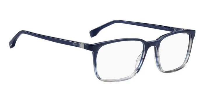 This square Hugo Boss optical comes in a blue horn and grey frame.