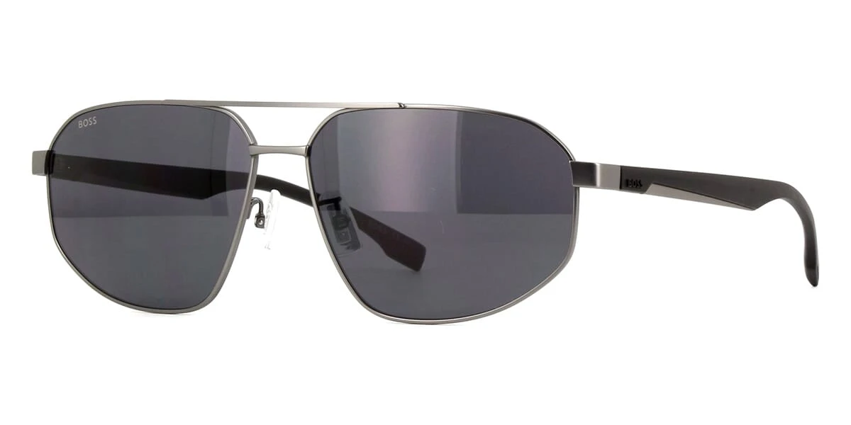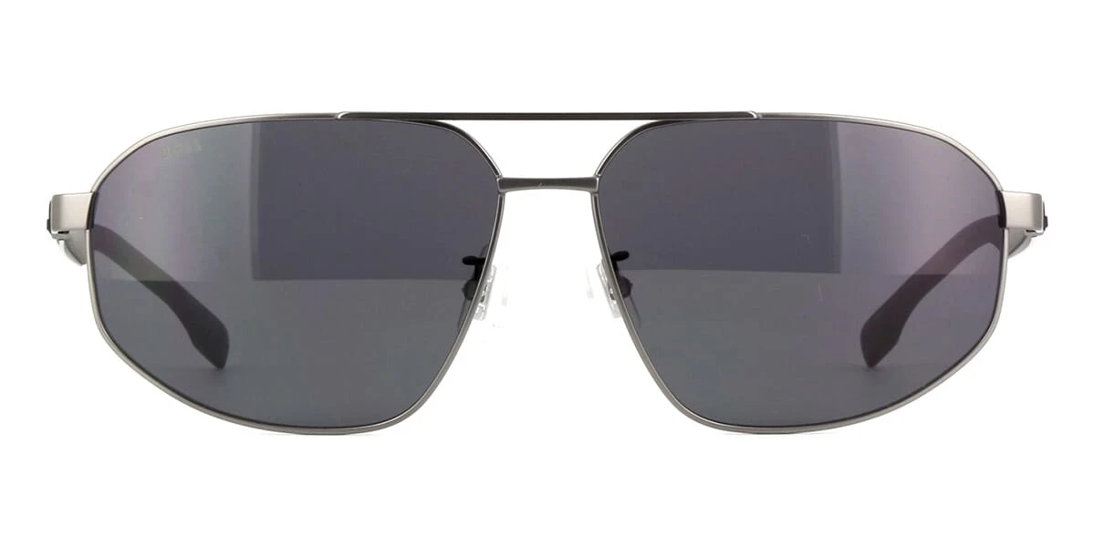 This square Hugo Boss sunglass comes in a matte dark ruthenium and black rubber frame with grey lenses.