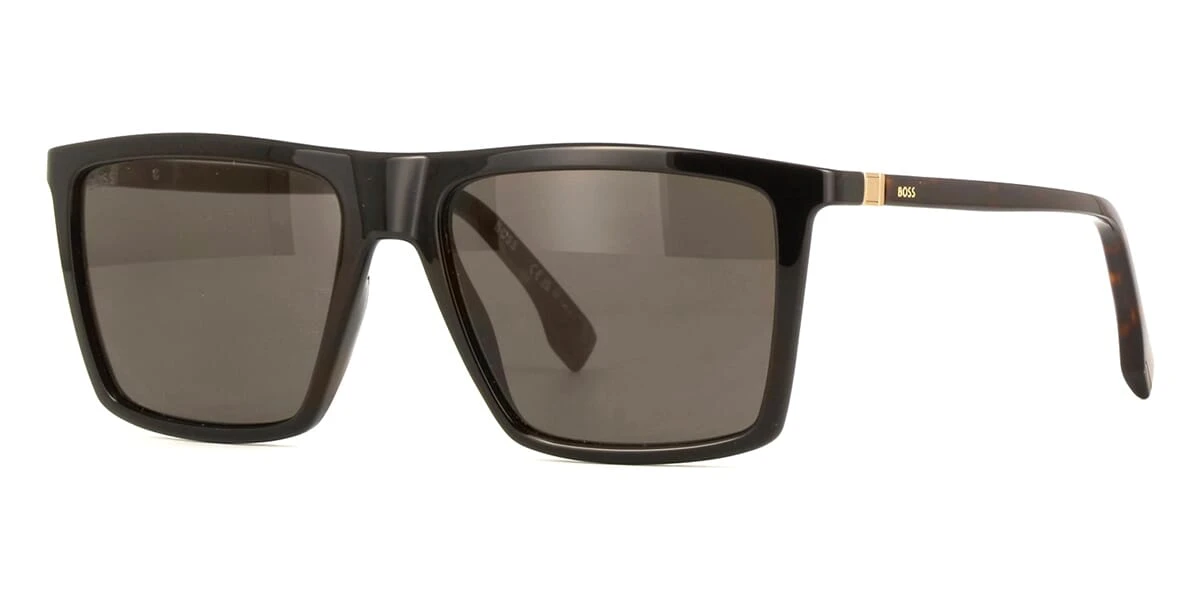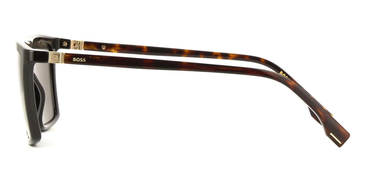 This square Hugo Boss sunglass comes in a shiny black with dark havana frame with grey with light mirror lenses.