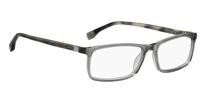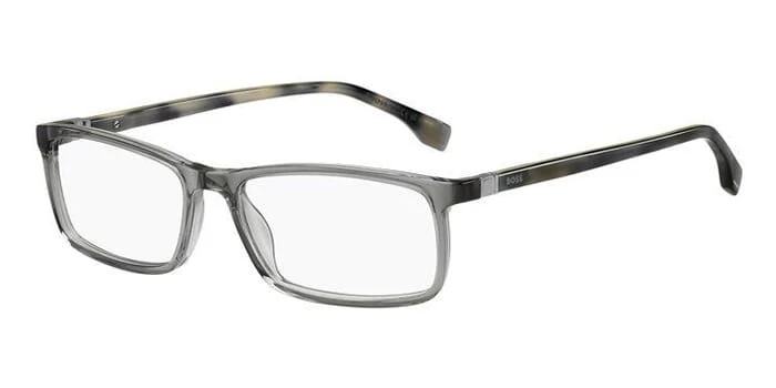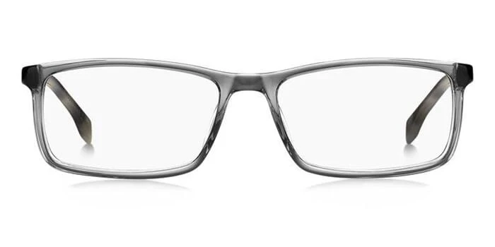 This square Hugo Boss optical comes in a transparent grey and havana frame.