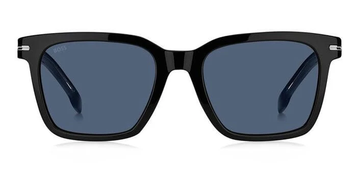 This square Hugo Boss sunglass comes in a black frame with blue lenses.