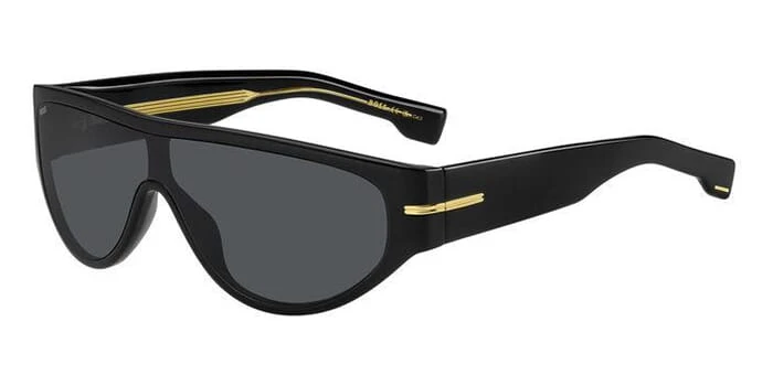 This shield Hugo Boss sunglass comes in a black frame with grey lenses.