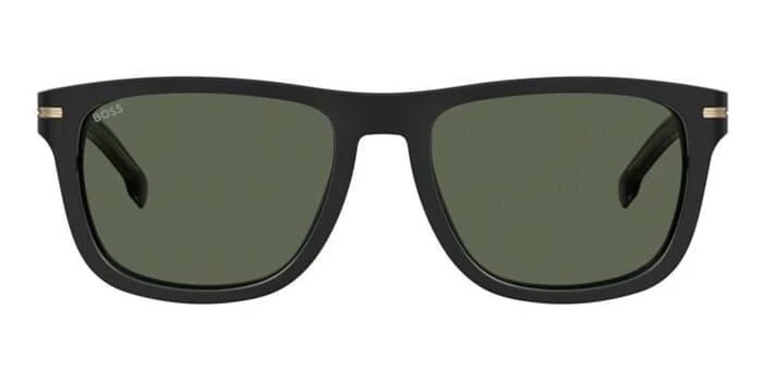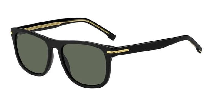This square Hugo Boss sunglass comes in a black with gold frame with green lenses.