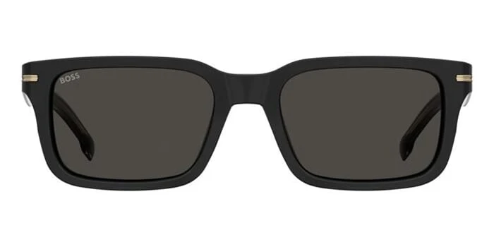 This square Hugo Boss sunglass comes in a black frame with grey lenses.
