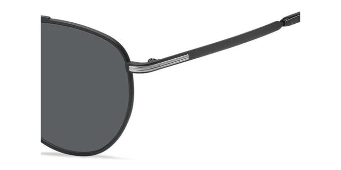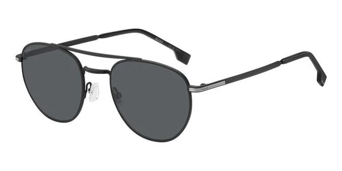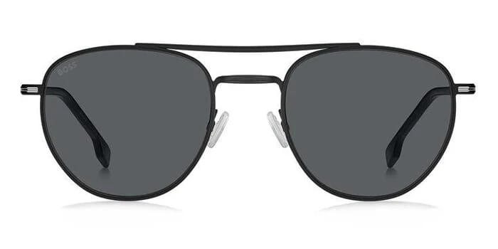 This square Hugo Boss sunglass comes in a matte black frame with grey lenses.