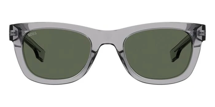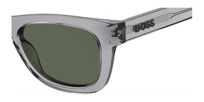 This square Hugo Boss sunglass comes in a crystal dark grey frame with green lenses.