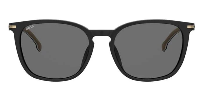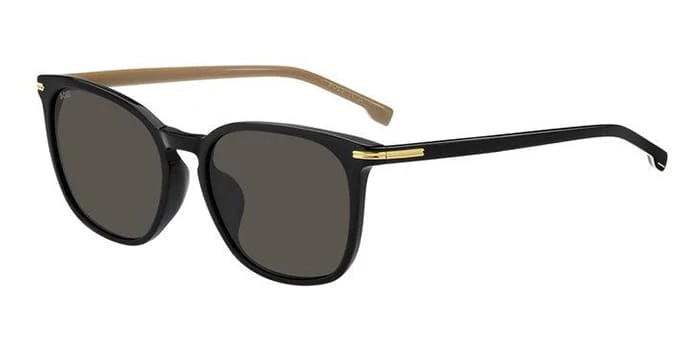 This square Hugo Boss sunglass comes in a black with gold frame with grey lenses.